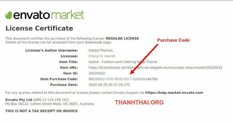 Nếu theme/plugin có yêu cầu activate purchased code, thì bạn mở file pdf, lấy purchased code (phần mình đánh dấu đỏ bên dưới) để active theme/plugin nhé