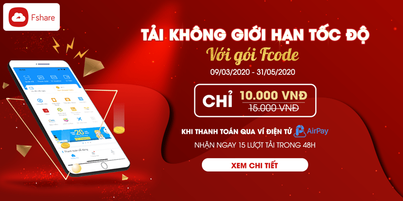 Từ ngày 09/03/2020 đến hết ngày 31/05, Fshare kết hợp với ví điện tử Airpay triển khai chương trình khuyến mãi: thanh toán Fcode qua ví điện tử Airpay, chỉ với 10.000đ (̶1̶̶5̶̶.̶̶0̶̶0̶̶0̶̶đ̶) sở hữu ngay 15 lượt tải trong 48H đăng ký.