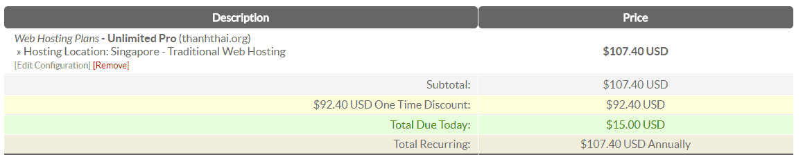 Như hình trên các bạn thấy là khi thanh toán bạn sẽ chỉ phải thanh toán 15$ mà thôi. Hãy tận dụng cơ hội để sở hữu cho mình hosting chất lượng nhé. Và nhớ chọn server Singapore để có tốc độ tốt nhất với người dùng Việt Nam nhé