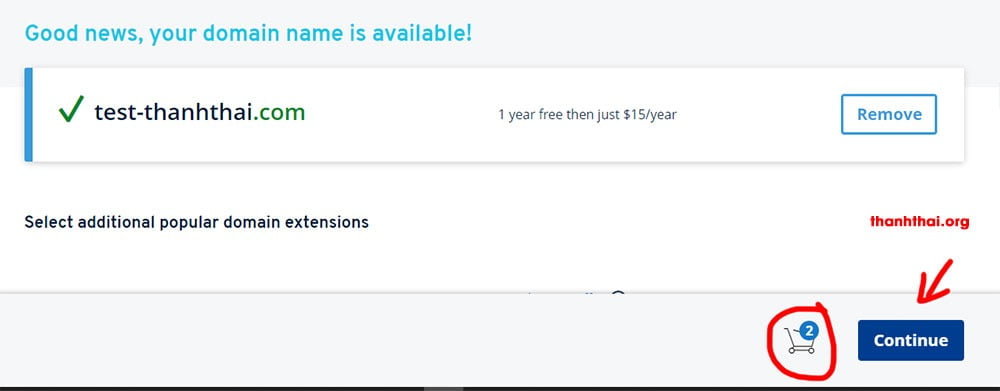 Ơn zời, domain test này chưa có ai đăng ký :). Bạn click Add to card để thêm domain đó vào giỏ hàng. Click Continue để chuyển sang bước tiếp theo